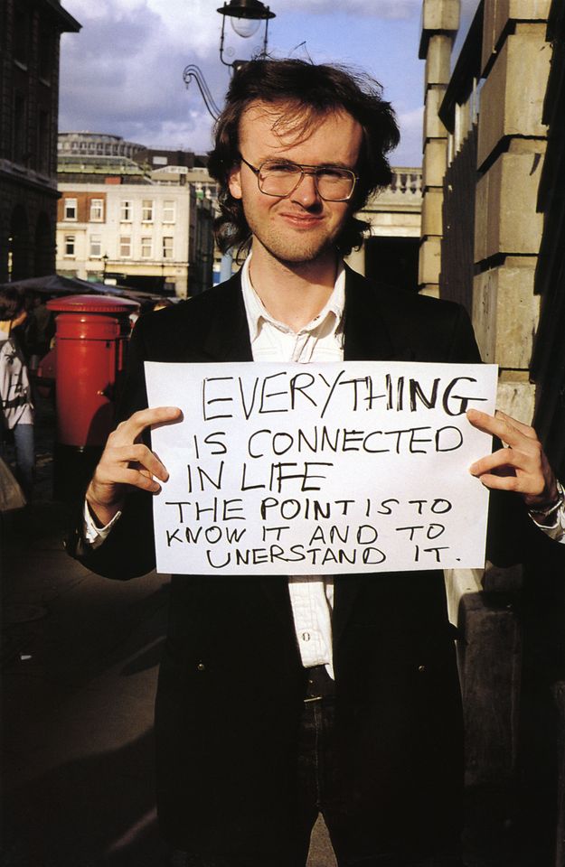 Wie nehmen Menschen ihre Umwelt wahr, worüber denken sie gerade nach – und was davon zeigen sie nach außen? Für die Fotoserie Signs that say what you want them to say and not Signs that say what someone else wants you to say (1992/93) sprach Wearing zufällig ausgewählte Passant*innen auf den Straßen Londons an. Sie sollten spontan einen Satz auf ein weißes Blatt Papier schreiben – einen Gedanken, der sie gerade beschäftigte. Anschließend fotografierte Wearing die Personen direkt vor Ort mit dem von ihnen selbst verfassten Text. Zehn dieser Fotografien sind aktuell in der Ausstellung Language/Text/Image. Can you hear me? Can you see me? in KAI 10 zu sehen.