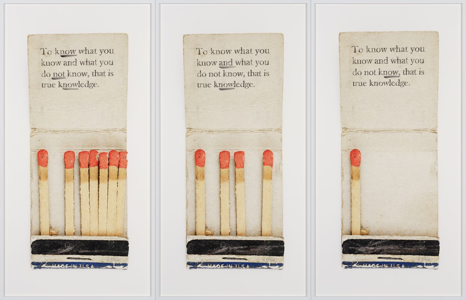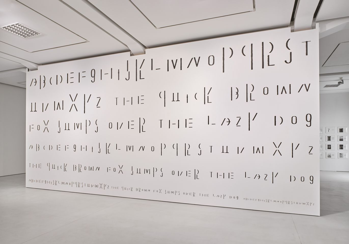 Die Ausstellung zeigt aktuell entstandene Werke, aber reicht auch weit in die Zeit vor der digitalen Vernetzung zurück: Fotografien von Gordon Parks aus den 1950er-Jahren zeigen Alltagsituationen im Süden der USA, wo die Separation von weißer und Schwarzer Bevölkerung auch durch regulierende Schilder allgegenwärtig war. Auf den Schildern, die die Personen auf Gillian Wearings Fotografien hochhalten, ist hingegen zu lesen, was ihnen selbst gerade durch den Kopf ging. Wie Sprache gesellschaftliche Prozesse reguliert, ist ein zentrales Thema bei Nadine Fecht. Ihr Vorgehen lässt sich auch in der Tradition der sprachanalytischen Konzeptkunst sehen, die durch zentrale Videoarbeiten von John Baldessari und Gary Hill vertreten ist. Formale Regeln bestimmen auch die Werke von Natalie Czech, die die Ausstellung in KAI 10 ergänzen. Sie weisen zudem eine spielerisch-poetische Seite auf, wie wir sie auch bei den Text-Bild-Kombinationen von Markus Vater finden. Ayşe Erkmen fragmentiert einen Blindtext aus lateinischen Buchstaben, sodass er an Hieroglyphen einer Schriftsprache außerhalb der westlichen Kultur denken lässt. Auf eine solche bezieht sich Alice Bidault, wenn sie die Knüpftechnik des Quipu zitiert, die von den Inkas in Südamerika entwickelt wurde. Textile Erinnerungen an Verstorbene sind die großformatigen bildgewaltigen Quilts des National AIDS Memorial Quilt, dem weltweit größten Gemeinschaftskunstprojekt, dessen handgefertigte Gedenktücher vom National AIDS Memorial in San Francisco gesammelt werden.