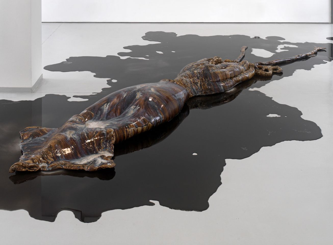 David Zink Yi, a Peruvian artist based in Germany, examines the animal theme in the context of his interest in the cryptic colossal squid. These mollusks are deep-sea dwellers and have never been seen by humans, except when their dead bodies have been found washed up on shore. David Zink Yi’s intention is to elevate the artistic status of this “nature’s refuse,” as he calls them. In his group of works titled Archetheutis he not only evokes the powerful, dead animals as natural phenomena, but also exalts their corpses, turning them into grand sculptures made of glazed ceramic. Their opalescent surfaces, supplemented by the black ink the animals use in self-defense, allude, as it were, to the gray area between life and death, this enduring natural state.