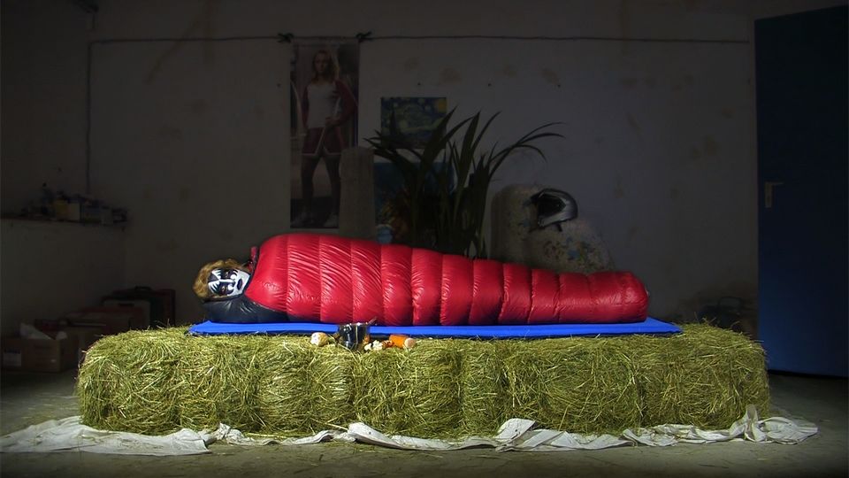 The German photographer and video artist Stefan Panhans makes short films that deal more with the visual than the narrative. Even though his occasionally elaborate films contain comprehensible content, the coherent plot expected of a film is missing. When watching these videos one may be reminded of the “living pictures” that were so popular in photography around 1900. Nevertheless, the author leaves no doubt that these presentations are eminently contemporary. His actors are often celebrities from the pop, art, or fashion scenes, but they can also be anonymous young people in even more contemporary, often more outlandish clothes. The video If A Store Clerk Gave Me too Much Change is a puzzling and mysterious projection about the metamorphosis of a person who turns into a caterpillar in a red sleeping bag, recalling Franz Kafka’s The Metamorphosis.