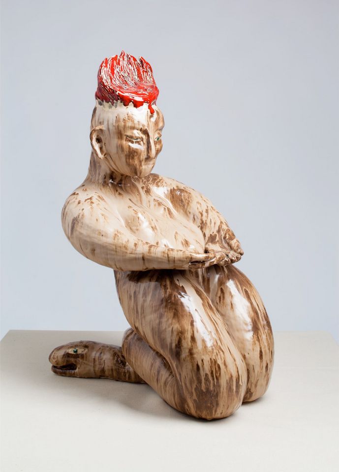 Czech artist Habima Fuchs (*1977in Ostrov, Czech Republic), who was born Astrid Sourkova, works in various media including sculpture, drawings, performances, and installations. She lives as a “cultural nomad” between the Czech Republic, Germany, France, Spain, and Italy. The range of the territory within which she moves is reflected in the breadth of the topics she addresses. She draws from myths and legends of diverse origins with primarily spiritual content. Animals like cats, lions, and tigers enter metamorphotic relationships with humans in Fuchs’ ceramic objects. In the cycle Daimonion, for instance, creatures appear with mixed body parts, some animal and some human, like the centaur in Greek mythology. Just as wild centaurs symbolize the power and sensuality of nature, the “demons” in Fuchs’ work suggest the spiritual powers which humans can draw from through direct and meditative contact with nature.