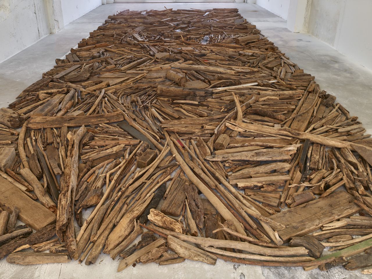 The approximately 40 square metre floor piece Rhine Driftwood Line was created in 2001 as part of an exhibition at the Museum Kurhaus Kleve. Long collected driftwood that had washed up in the last kilometre of the German Rhine before the Dutch border – a direct testimony to his process-based, site-specific way of working. The geometrically designed installation varies in its dimensions and follows a formal order specified by Long. The work was last exhibited in 2013 at the Museum DKM in Duisburg – the same venue where Long was honoured with the renowned Wilhelm Lehmbruck Prize in 1996.